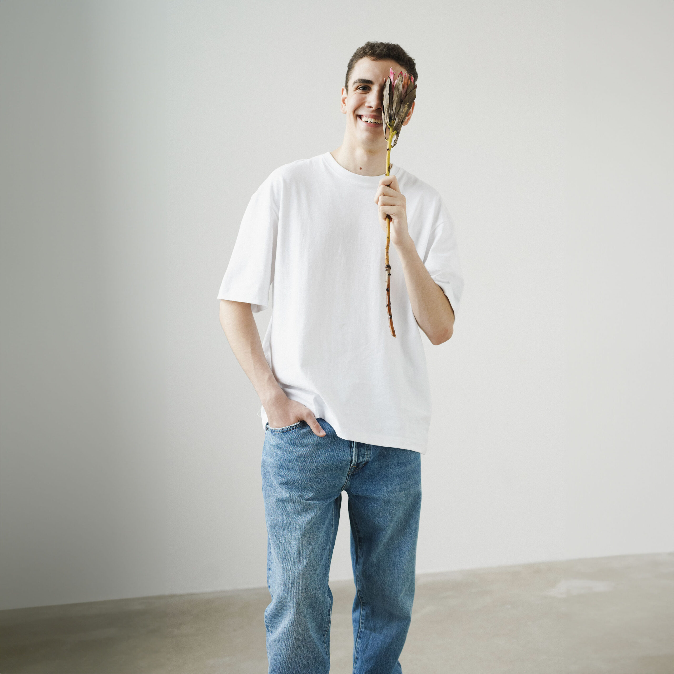 95% Cotton, 5% Polyester. Cold wash with similar colors. Handle with love.